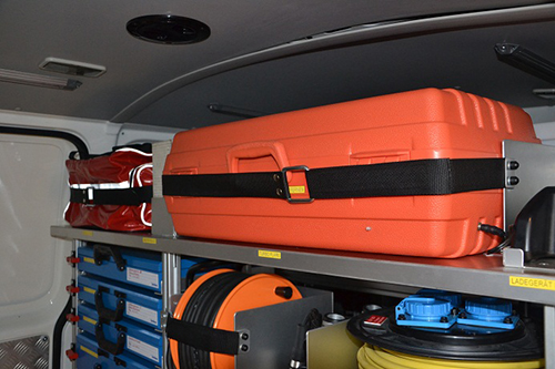 • Werkzeug und Signalausstattung in Regalen aus Aluprofil gelagert