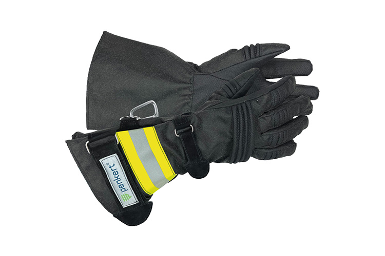 Feuerwehrschutzhandschuh FIREDEVIL PREMIUM 3.0 long von Penkert. Dieser Feuerwehrschutzhandschuh bietet herausragenden Kontakthitzeschutz, minimiert Schrumpfung und Materialverhärtung, ist winddicht, wasserdicht und atmungsaktiv. Diese Feuerwehrhandschuhe mit Reflexstreifen kombinieren das taktile Empfinden eines Lederhandschuhs mit den leistungsstarken Eigenschaften eines textilen Feuerwehrhandschuhs. Hergestellt aus Para-Aramid (KEVLAR®, schwarz) und mit einer Silikon-Carbon-Beschichtung versehen, bietet er sicheren Halt und hohe Abriebfestigkeit. Mit einem D-Ring zur Befestigung und einem umlenkbaren Klettverschluss ausgestattet, sorgt der Handschuh für eine sichere und bequeme Passform. Die Reflexstreifen auf dem Stulpenrücken erhöhen die Sichtbarkeit und somit die Sicherheit im Einsatz. Die lange Stulpe, ebenfalls aus KEVLAR® mit flammfester Silikon-Carbon-Beschichtung, bietet zusätzlichen Schutz für Unterarm und Handgelenk. Der umlenkbare Klettverschluss ermöglicht eine individuelle Anpassung und sorgt dafür, dass der Handschuh auch unter extremen Bedingungen sicher sitzt.