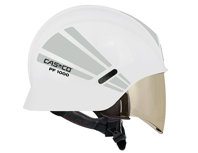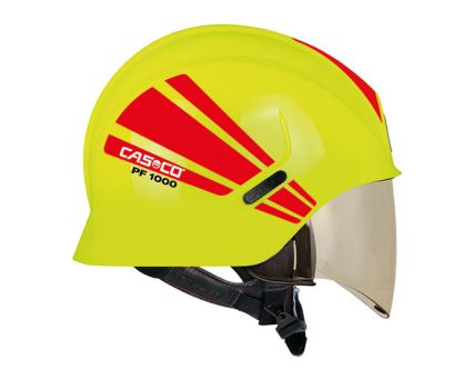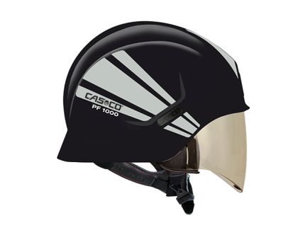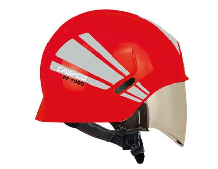 Feuerwehrhelm CASCO PF1000 EXTREME nach EN443:2008, mit Reflexstreifen und integrierten Panorama Visier aus thermisch stabilem PPSU-Material, neue GFK-Helmschale gefertigt aus Hochleistungsglasfaser Verbundmaterial GFK60, Innenschale Polyurethan, stoßdämpfend, mit zusätzlicher Polycarbonatverkleidung für längere Haltbarkeit, bessere Stabilität, Innenausstattung Kopfring mit Lederpolsterung, komplett austauschbar, verstellbares Stirnteil, 3 Punkt-Kinn-Nacken-Beriemung mit Druckkastenschloss. Der Helm zeichnet sich durch ausgezeichneten Tragekomfort sowie hohen Sicherheitsreserven aus. Die Helmschale ist komplett geschlossen und nicht durchbohrt, was ein Hitzedurchschlag verhindert.