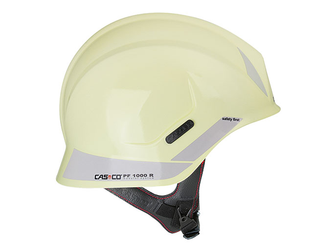 Feuerwehrhelm CASCO PF 1000 R nach EN443:2008, mit Reflexstreifen, neue GFK-Helmschale gefertigt aus Hochleistungsglasfaser Verbundmaterial GFK60, Innenschale Polyurethan, stoßdämpfend, mit zusätzlicher Polycarbonatverkleidung für längere Haltbarkeit, bessere Stabilität, Innenausstattung Kopfring mit Lederpolsterung, komplett austauschbar, verstellbares Stirnteil, 3 Punkt-Kinn-Nacken-Beriemung mit Druckkastenschloss. Der Helm zeichnet sich durch ausgezeichneten Tragekomfort sowie hohen Sicherheitsreserven aus. Die Helmschale ist komplett geschlossen und nicht durchbohrt, was ein Hitzedurchschlag verhindert.