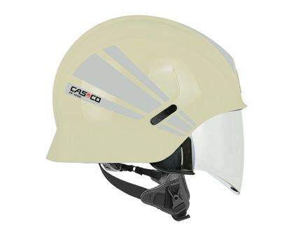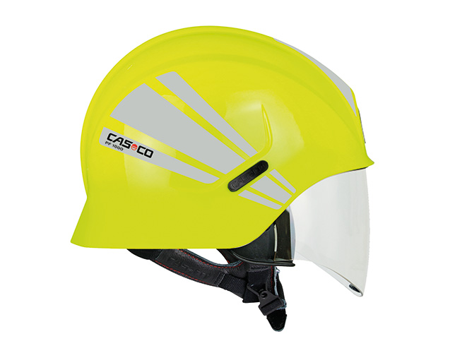 Feuerwehrhelm CASCO PF 1000 R-V nach EN443:2008, mit Reflexstreifen und integrierten Panorama Visier aus Polycarbonat, neue GFK-Helmschale gefertigt aus Hochleistungsglasfaser Verbundmaterial GFK60, Innenschale Polyurethan, stoßdämpfend, mit zusätzlicher Polycarbonatverkleidung für längere Haltbarkeit, bessere Stabilität, Innenausstattung Kopfring mit Lederpolsterung, komplett austauschbar, verstellbares Stirnteil, 3 Punkt-Kinn-Nacken-Beriemung mit Druckkastenschloss. Der Helm zeichnet sich durch ausgezeichneten Tragekomfort sowie hohen Sicherheitsreserven aus. Die Helmschale ist komplett geschlossen und nicht durchbohrt, was ein Hitzedurchschlag verhindert.