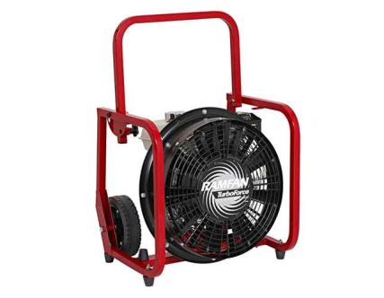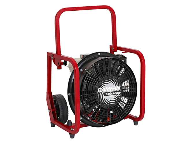 Drucklüfter GX 350 Power Stream Technologie RAM FAN mit 4-Takt Honda 4,5 kW/5,5 PS Motor, Luftfördermengen: nach AMCA 240-33.830 m³/h, Arbeitsgeräusch in 3 m Entfernung 96 dB, 2 besonders breite und große Transporträder, 2 Standfüße, automatische Einstellung des optimalen Neigungswinkels beim Hochziehen des Tragegriffs, Feineinstellung zwischen +10° und +20°, 550 x 550 x 500 mm, Gewicht ca. 39 kg