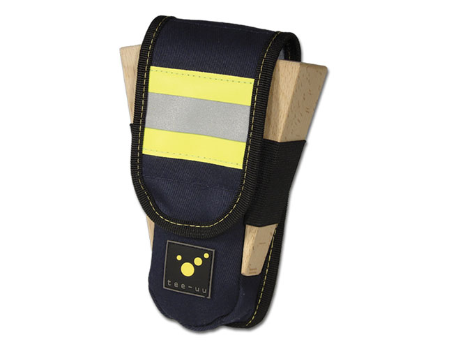 Schlanker Holster zur Aufnahme einer Rettungsscheren oder –messer und Türkennzeichnungsbänder oder alternativ für eine Rettungsschlinge. Zwei Halteschnüre mit Karabinerhaken sichern das Material. Zwei außen liegende Elastikschlaufen für Holzkeile runden die Ausstattung ab. Das Klettschlaufensystem erlaubt die Befestigung am KOMBI Leinenbeutel bzw. am Schulter- oder Hüftgurt des Atemschutzgerätes auch um 180° gedreht: somit fällt z.B. die Rettungsschere von selbst aus dem Holster und ist dennoch an der Halteschnur mit Karabinerhaken gesichert. Ein Beschriftungsfeld auf der Deckelinnenseite erlaubt eine dauerhafte Kennzeichnung (z.B. FF Musterstadt 40/1). Der 50mm breite Signal-Reflexstreifen sorgt für zusätzliche Sicherheit.