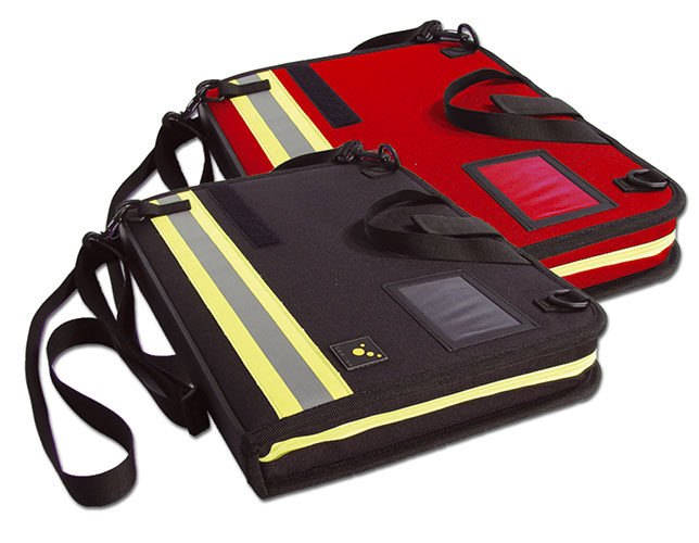 Für alle notwendigen Dokumente und Führungsmittel, egal ob bei Feuerwehr, Rettungsdienst, THW oder Polizei: Eine mobile Einsatzdokumentation ist für jede BOS unverzichtbar. „Finden statt Suchen“ lautet das Motto des BIG Einsatz-Organizers, der unter anderem mit fünf farbig markierten DIN A4 – Formularfächern aufwartet. Eine schnelle Zuordnung ist so gewährleistet. Für Schreibgeräte stehen drei Stifthalter zur Verfügung. Weitere Büromaterialien wie z.B. Taschenrechner, Haftnotizzettel oder Textmarker lassen sich in zwei Flachfächern und einem verschließbaren Netzfach verstauen. Im Transparentfach ist das Display des Mobiltelefons bzw. Smartphones erkennbar und selbiges sicher abgelegt. Die Ringbuchmechanik erlaubt zusammen mit der großzügigen Breite des Organizers ein Abheften von DIN A4 Schnellheftern mit Abheftvorrichtung oder aber auch das Ablegen von gefalteten DIN A3 Klarsichthüllen mit Einsatz- und Objektplänen. Für die Einsatzdokumentation ist ein Schreibbrett mit Metallklammer sowie ein Stifthalter auf der Rückseite des Organizers integriert. Dort befindet sich auch ein transparentes Fach zur geschützten Aufbewahrung und sicheren Bedienung eines Tablet-PCs. Das integrierte Tragesystem erlaubt dabei eine leichte Bedienung bei entspannter Haltung. Das Gewicht des Organizers und ggf. Tablet-PCs lastet dabei auf Nacken und Bauch. Beim fußläufigen Erkunden der Einsatzstelle besteht zudem die Möglichkeit, die Mappe rasch mit einem Klettverschluss zu sichern und seitlich über die Schulter zu hängen. Der 50mm breite Sicherheits-Reflexstreifen, das Adressfach sowie der Klettflausch für den persönlichen Namensstreifen runden die großzügige Mappe ab.
