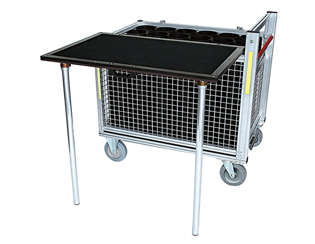 Rollcontainer für 24 Atemluftflaschen ohne Transportsicherung, stabile UV beständige Köcher aus schwarzem PE Kunststoff mit gepolstertem Boden, passend für Flaschenlänge bis 700 mm und Durchmesser von 170 mm, L x B x H 1200 x 800 x 1200 mm, Höhe bis Oberkante Gitterbox 1025 mm, Gewicht ca 119 kg