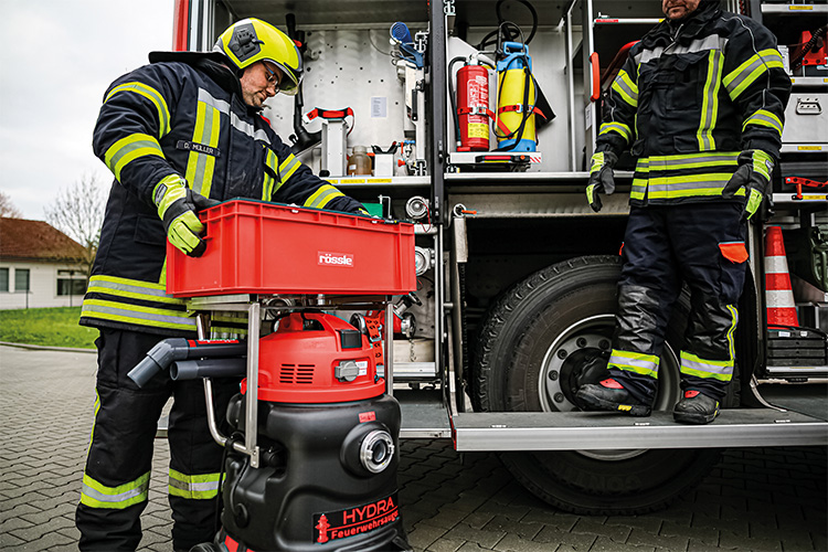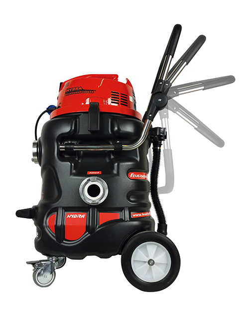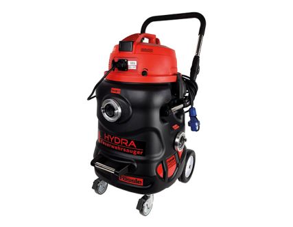 Saugkopf mit OSM Turbinensystem, Saugleistung regulierbar über ein stufenloses Stellrad, Stromkabel mit Personenschutzschalter, Rücklaufventil im Tank vergrößert und in Klarsicht Kunststoff erstellt zur Vorbeugung von Verstopfungen. Eine