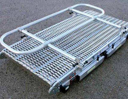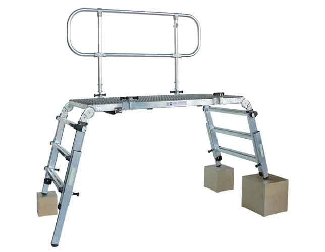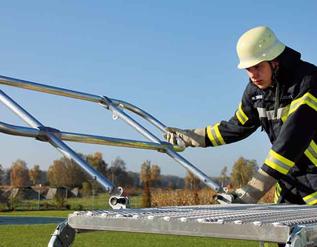 Rettungsplattform für Feuerwehren - Günzburger Steigtechnik NEU in verbesserter Ausführung aus Aluminium, Tragfähigkeit max 500 kg. Aufbau ohne Schrauben un Werkzeug, Plattform aus rutschsicherem Gitterrost, abklappbares abnehmbares Geländer. Höhenverstellbar im Raster von ca. 0,88-1,4 m, Niveauausgleich mittels Holmverlängerungen an allen 4 Standfüßen