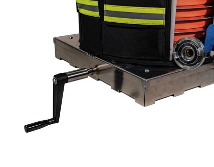 Nach dem Einsatz wird die TACBAG mittels einer Handkurbel aufgerollt, ohne dass die Tasche geöffnet werden muss.